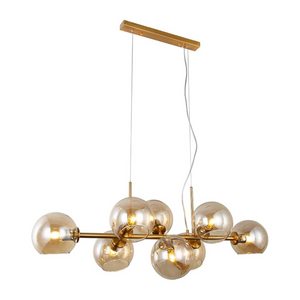 Introduce an elegant pendant lamp featuring a gold-toned frame and clear glass spheres, ideal for placement above dining tables. Combining a linear structure with refined materials, it offers balanced illumination and a visually distinctive centrepiece suitable for modern or classic interiors.