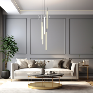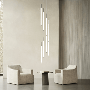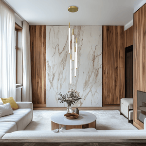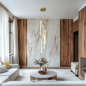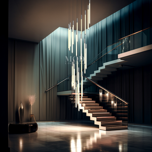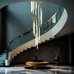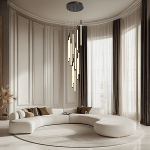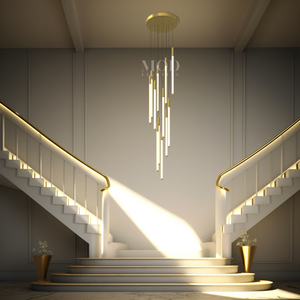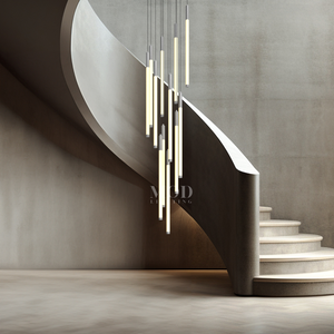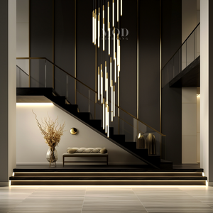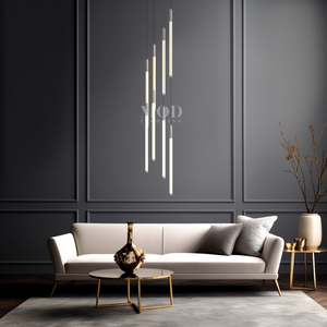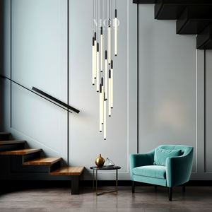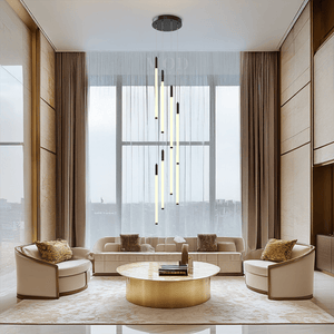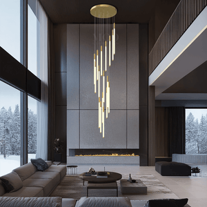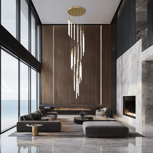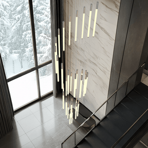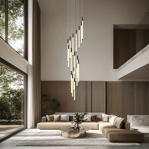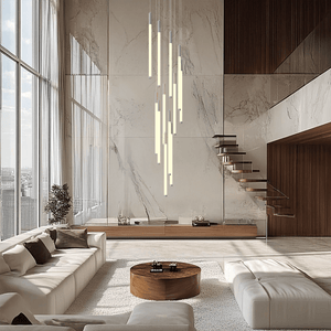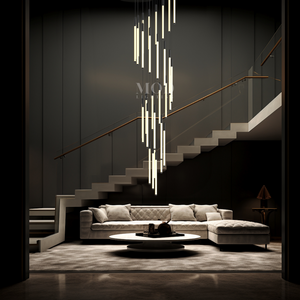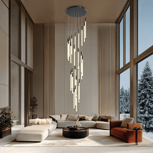 This vertical chandelier is designed to suit high ceilings, staircases, foyers, and vaulted areas. The layered tier layout provides downward light coverage. Cable length can be adjusted to match different ceiling heights, making it suitable for residential or commercial.